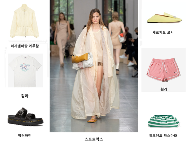 스포트막스의 2021 S/S 컬렉션에서는 워터프루프 소재의 코트에 짧은 쇼츠를 매치하고, 컬러감이 있는 가방이나 샌들을 활용하여 경쾌한 스타일링을 선보였다. 이처럼 비에 젖어도 끄떡없는 소재를 활용하거나 짧은 상의와 하의를 매치하는 캐주얼하고 실용적인 스타일링을 제안한다.