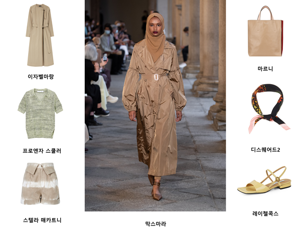 이자벨마랑의 베이지 컬러 레인 코트는 클래식함과 모던한 무드를 자아내고, 이너로 프로엔자 스쿨러의 얇은 니트 소재의 피케 셔츠와 스텔라 매카트니의 타이다이 데님 쇼츠를 매치하면 산뜻하고 트렌디한 매력을 보여줄 수 있다. 여기에 두건으로 포인트를 주거나 디스퀘어드2의 쁘띠 사이즈 스카프로 네크라인을 장식하고, 마르니에서 선보인 베이지와 레드 컬러 배색이 돋보이는 토트백, 레이첼콕스의 광택감 있는 스트랩 샌들 등으로 자칫 밋밋할 수 있는 톤온톤 룩에 포인트를 줄 수 있다.
