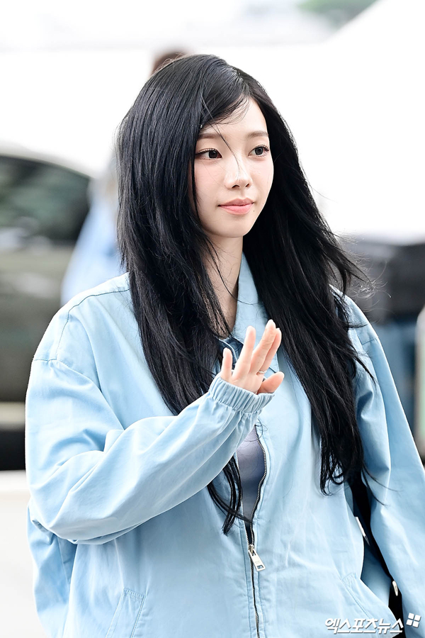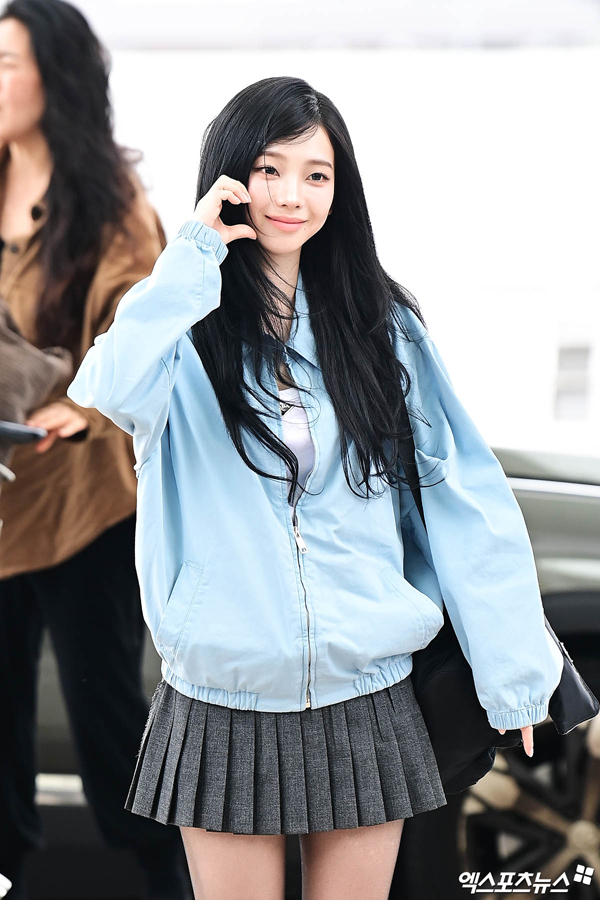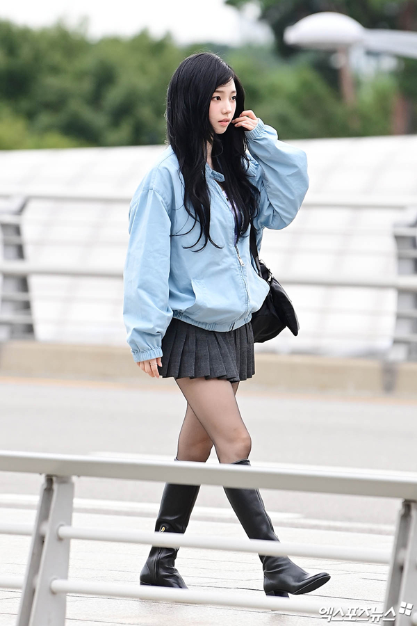 이날 카리나는 하늘빛 블루 점퍼에 그레이 플리츠 미니스커트, 블랙 롱부츠를 매치하며 청량하면서도 걸리시한 공항패션을 선보였다. 루즈한 아우터와 슬림한 하의의 대비가 경쾌한 실루엣을 완성했으며, 내추럴하게 풀어내린 긴 흑발이 카리나 특유의 세련된 매력을 더했다.