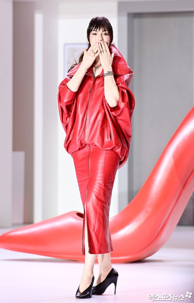 이날 그는 광택감이 돋보이는 레더 소재의 오버사이즈 재킷과 슬림한 펜슬 스커트를 매치해 극적인 대비를 완성했다. 볼륨감 있는 상의와 바디라인을 강조하는 하의의 조합은 클래식하면서도 현대적인 실루엣을 동시에 드러냈다.